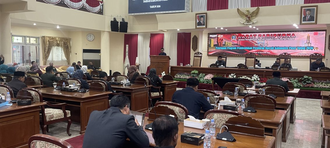 Tana Paser - DPRD Kabupaten Paser menggelar Rapat Paripurna dengan agenda menetapkan Program Pembentukan Peraturan Daerah (Propemperda) Tahun 2026, Kamis (27/11/2025). Rapat paripurna dipimpin Wakil Ketua I DPRD Paser Zulkifli Kaharuddin, diikuti Wakil Ketua II DPRD Paser Hendrawan Putra dan hadir 26 anggota DPRD Paser. Selain itu hadir Wakil Bupati Paser Ikhwan Antasari, Sekda Paser Katsul Wijaya, mewakili unsur Forkopimda, jajaran staf Ahli Bupati, jajaran Asisten, Kepala OPD dan tamu undangan lainnya. Dalam laporannya, Bapemperda diwakili Zulfikar Yusliskatin mengatakan DPRD dan pemerintah daerah sepakat mengusulkan 13 Raperda tahun 2026, Adapun 13 Raperda 2026 yakni Raperda tentang Pertanggung Jawaban Anggaran Pendapatan dan Belanja Daerah Tahun 2025, Raperda tentang Perubahan Anggaran Pendapatan dan Belanja Daerah Tahun 2026, Raperda tentang Anggaran Pendapatan dan Delanja Daerah Tahun 2027 dan